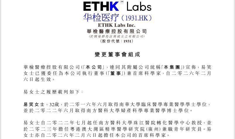 智通财经APP获悉,2月6日晚间,华检医疗宣布,年仅32岁的顶尖科学家易笑博士获委任为公司执行董事兼首席科学家。